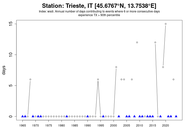 Una forma de medir las olas de calor es utilizando el índice WSDI6, que señala la presencia de una ola de calor cuando durante por lo menos 6 días consecutivos, la temperatura máxima diaria supera el percentil 90 de la temperatura máxima diaria de la serie de años. El percentil 90 significa el 10% de los valores de temperatura diaria más altos registrados en la serie de años analizada.